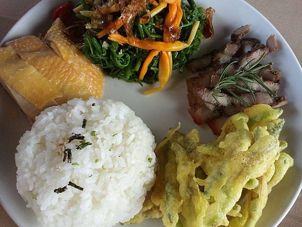 有土雞和山豬肉,跟炸金針和龍鬚菜。