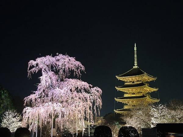 東寺最有名就是五重塔與不二櫻交織而成夢幻夜景!