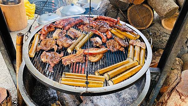 一旁正烤著的豬肉香腸和竹筒飯,這些在套餐中都有。