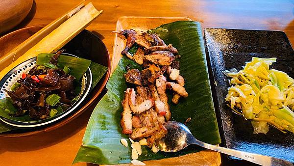 中間那道菜是鹹豬肉和煙薰斑鳩,
