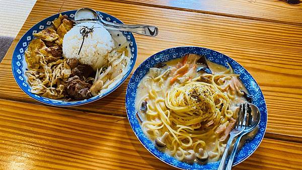 餐點部份我們點了辣白醬燻雞義大利麵和古早味擴肉飯,
